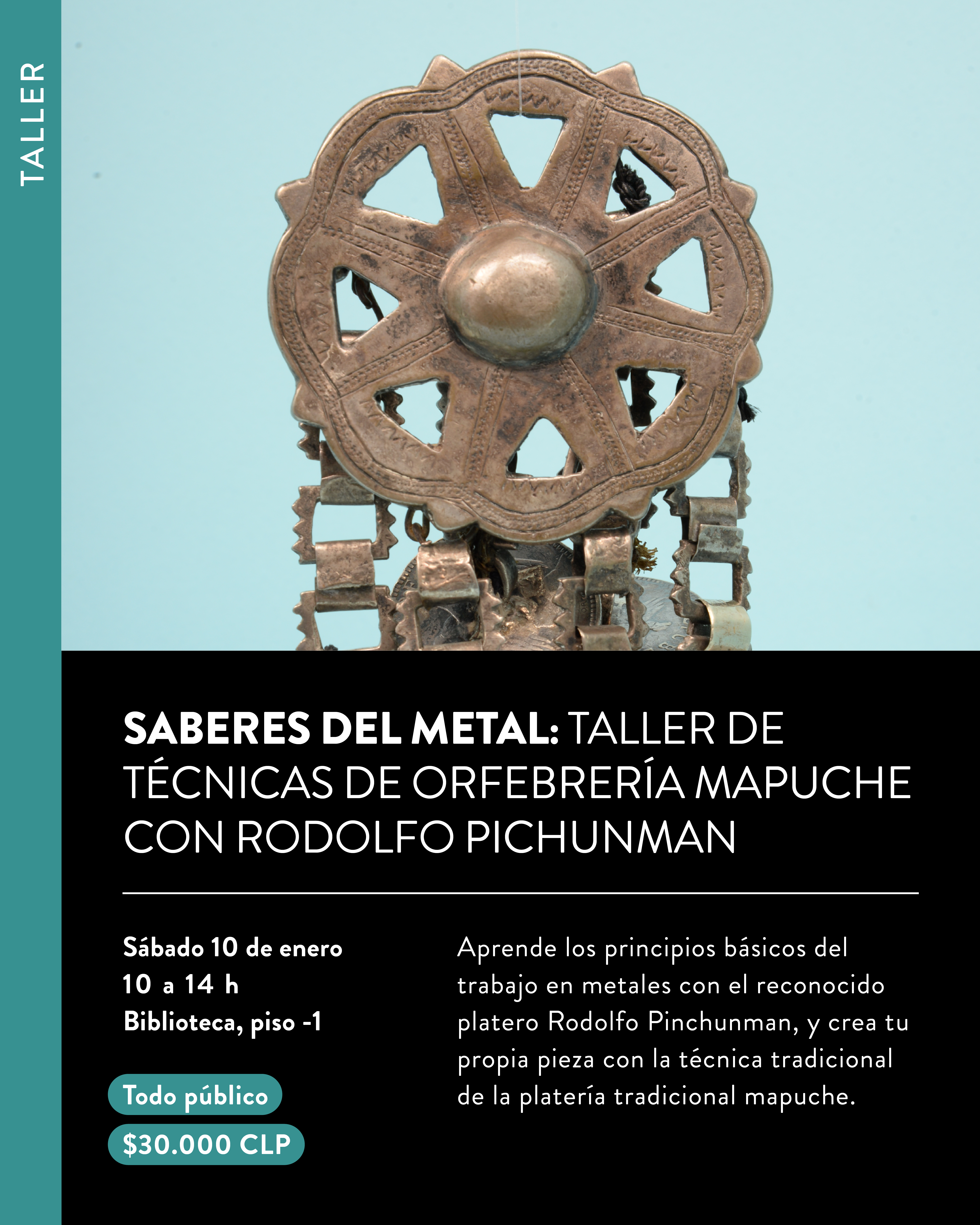 En diálogo con la exposición “Vivos y Presentes. Arte de los pueblos Atacameño/Lickanantay, Mapuche y Rapanui”, la experiencia propone una aproximación práctica y respetuosa a los saberes mapuche vinculados a la orfebrería, poniendo en valor la continuidad de estos conocimientos y su relación con el territorio, la memoria y el cuerpo. Al finalizar, cada participante habrá experimentado los fundamentos de este quehacer y podrá llevarse una pequeña pieza creada durante la sesión.