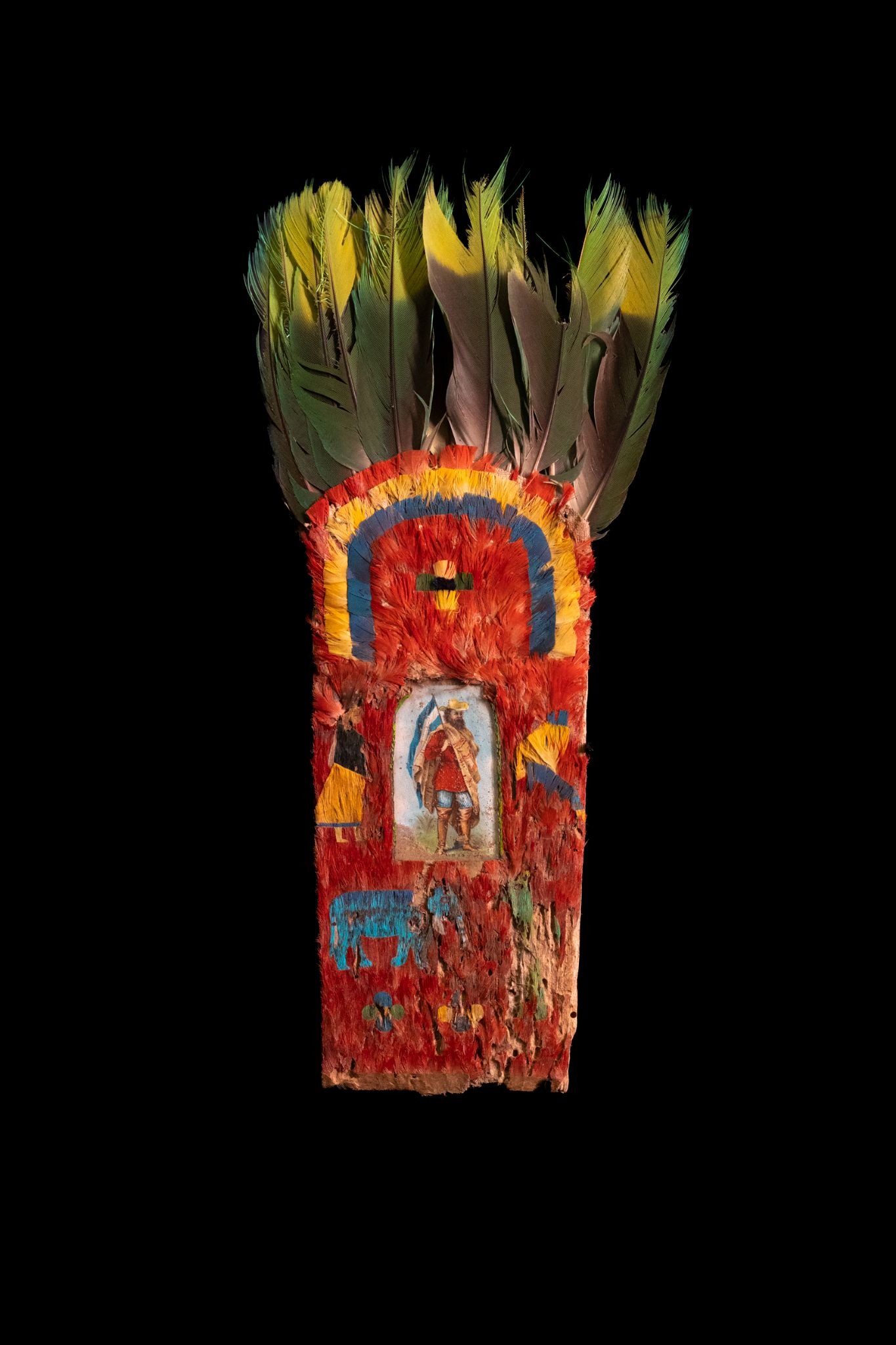 En el altiplano boliviano, el pueblo Aymara utiliza plumas de aves amazónicas para la producción de indumentaria usada en bailes y ceremonias, como este ornamento para el pecho, usado en el baile jhula-jhula. Plumas, madera, arpillera y pintura; 35 x 15 cm. MChAP 1831. Fotografía de Micaela Valdivia